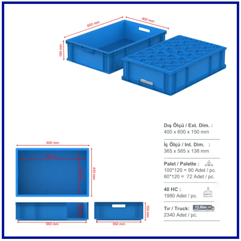 400x600 mm kasa, yanları ve altı kapalıdır. Güçlendirilmiş tabanlıdır. El korumalı tutma yeri mevcuttur ve üst üste istiflenebilir. Material: % 100 Orijinal PPC Lacivert ve Geri dönüşüm PP Gri , Mavi renklerde standart olarak üretilmektedir.