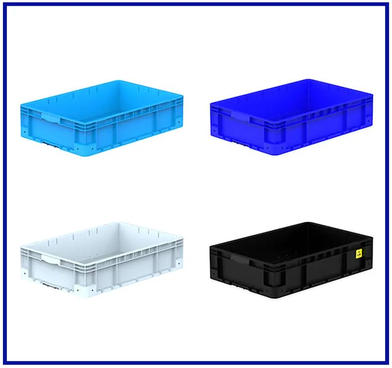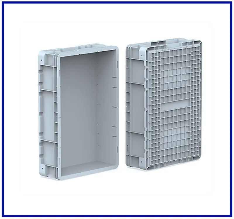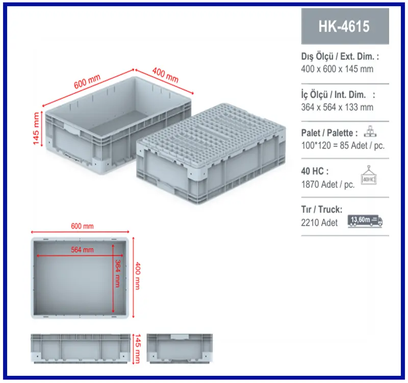 400x600 mm kasa, yanları ve altı kapalıdır. Güçlendirilmiş tabanlıdır. El korumalı tutma yeri mevcuttur ve üst üste istiflenebilir. Material: % 100 Orijinal PPC Lacivert ve Geri dönüşüm PP Gri , Mavi renklerde standart olarak üretilmektedir.