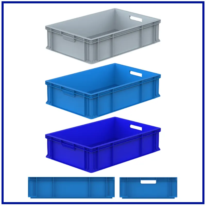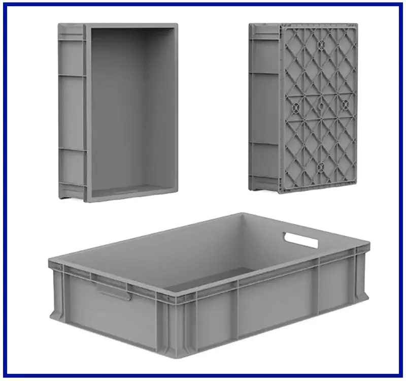 400x600 mm kasa, yanları ve altı kapalıdır. Güçlendirilmiş tabanlıdır. El korumalı tutma yeri mevcuttur ve üst üste istiflenebilir. Material: % 100 Orijinal PPC Lacivert ve Geri dönüşüm PP Gri , Mavi renklerde standart olarak üretilmektedir.